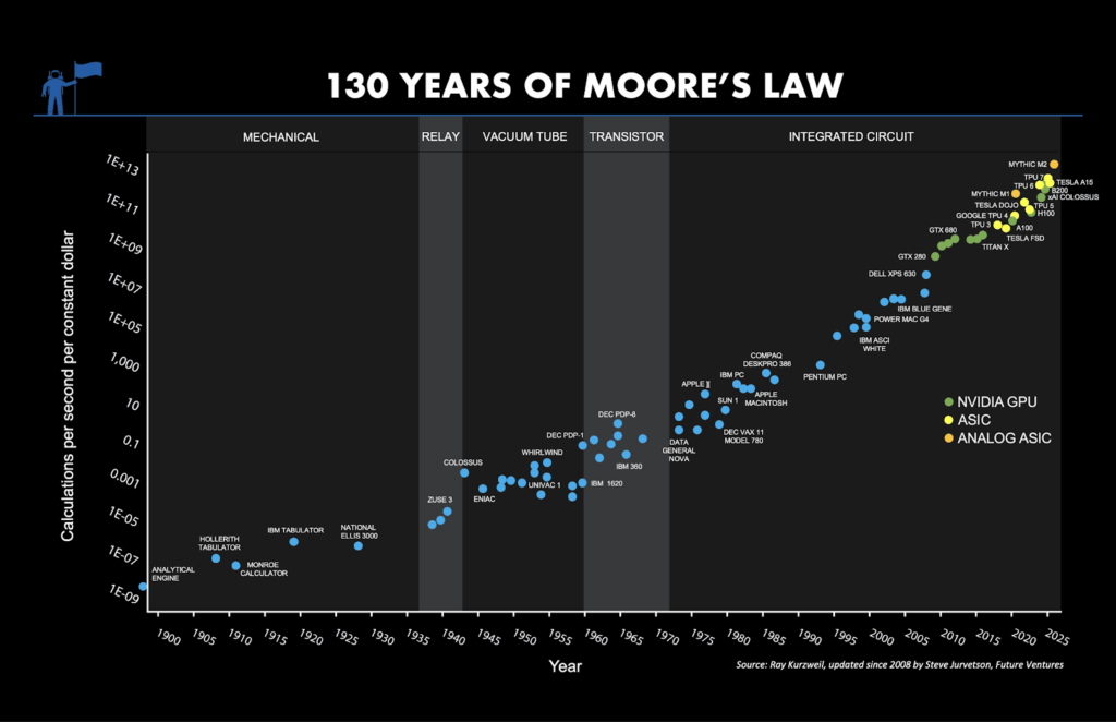 Each price reduction has expanded applicability (as illustrated by Jevon’s paradox). Computers were initially used only for high-value scientific or military endeavors. These applications subsequently gave way to business tools, gaming, and entertainment. Currently, computers serve as the foundation for AI, which is, in turn, generating unprecedented demand for computational power.